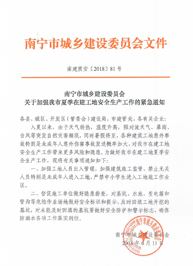 南宁市城乡建设委员会关于加强我市夏季在建工地安全生产工作的紧急通知——南建质安[2018]81号